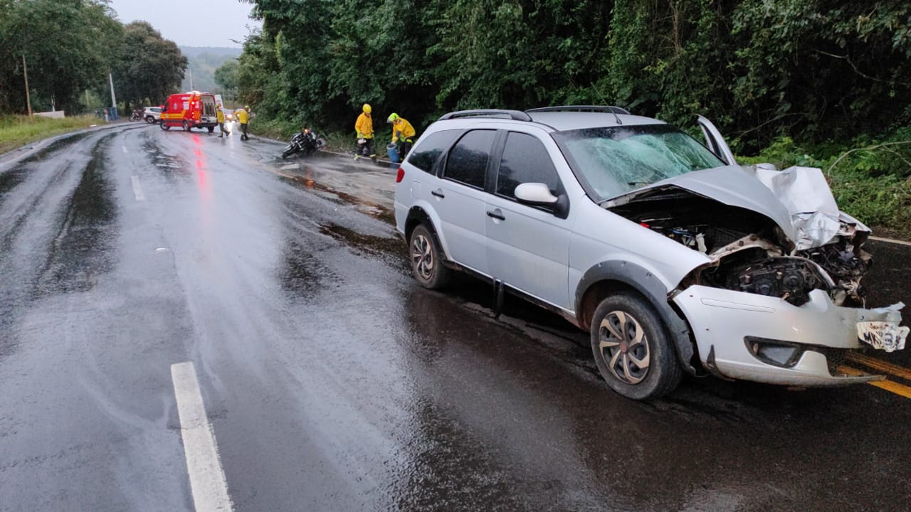 Condutor da moto foi a óbito no local. O Corpo de Bombeiros atendeu um acidente de trânsito envolvendo um carro e uma moto, na