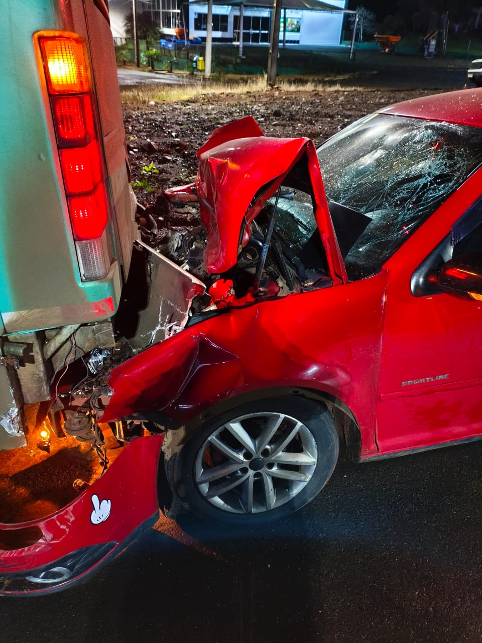 Na madrugada deste sábado (28), por volta das 5h28min, uma colisão traseira entre um automóvel e um ônibus de turismo foi registrada no trevo da